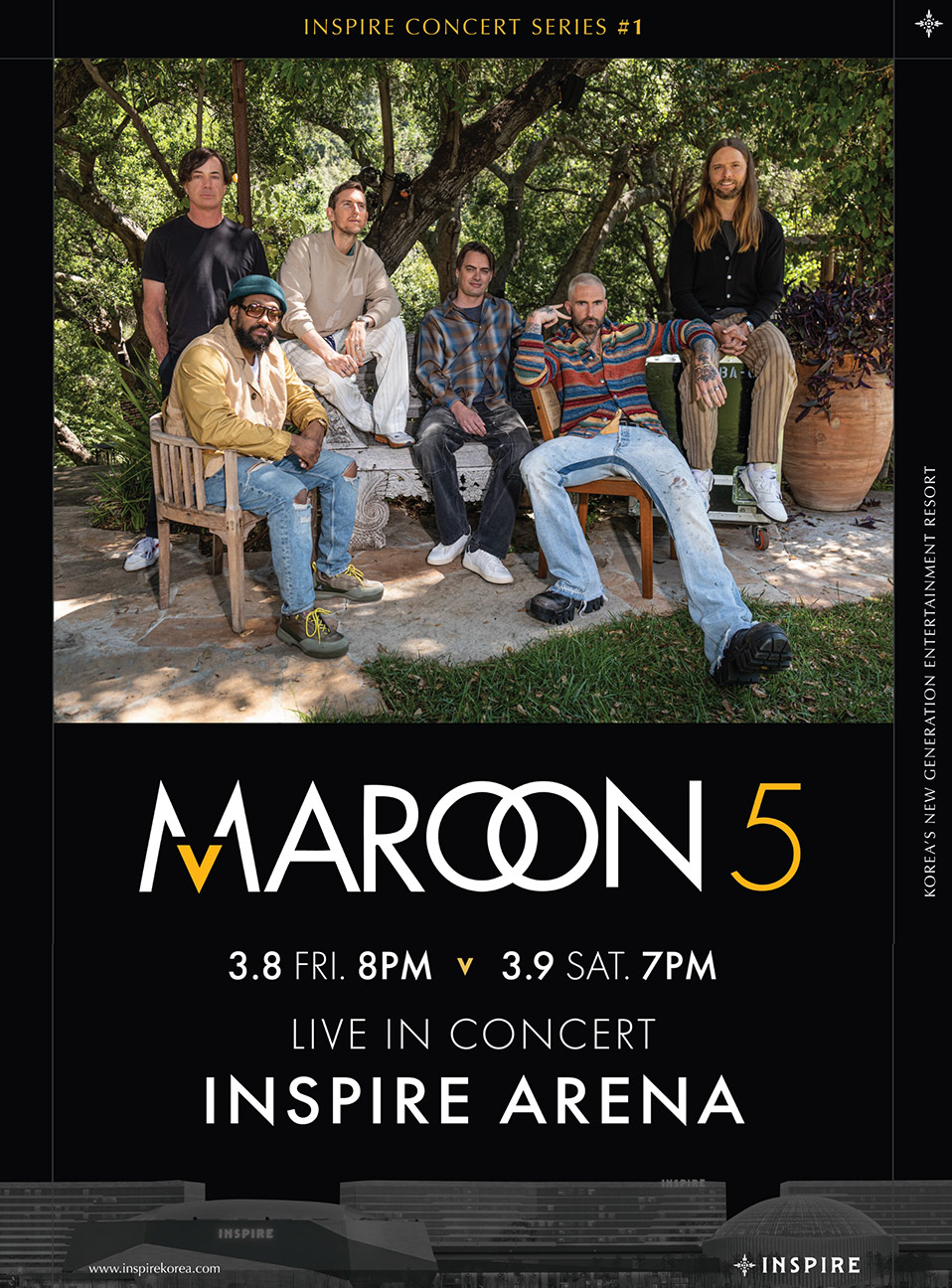 3월 8일과 9일, 국내 최초 다목적 공연 전문 인스파이어 아레나(INSPIRE Arena)에서 트렌디한 감성의 팝 록 음악으로 21세기의 가장 인기 있는 아티스트로 손꼽히는 마룬 파이브(Maroon 5)가 해외 가수로서는 처음으로 공연의 포문을 연다고 합니다. 소중한 추억 만드는 시간이 되셨으면 좋겠습니다.