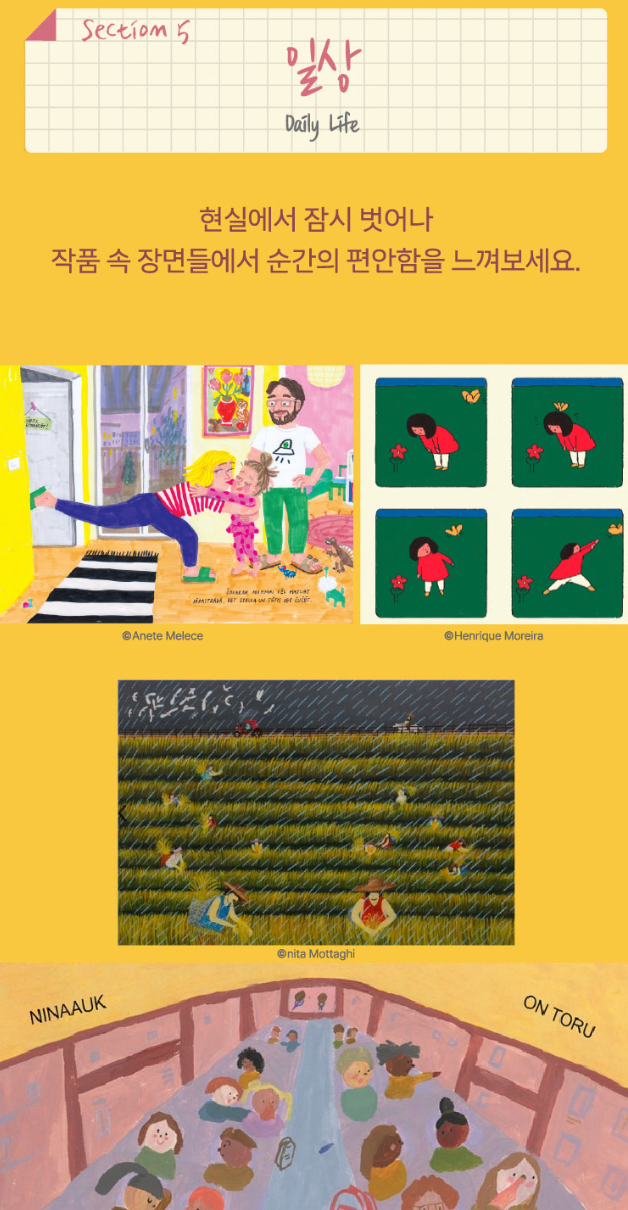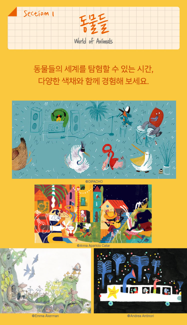 책 속으로 들어가는 듯한 전시공간이며 볼로냐 한국전시 최초로 선보이는 일러스트레이터의 벽 최신 일러스트 트렌드를 만나볼 수 있는 전시이며 올해 일러스트 80명의 400점의 넘는 작품들이 준비되어 있다고 합니다.