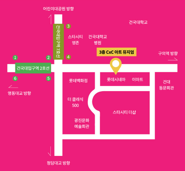 - 오시는 길 롯데시네마 건대입구 3층(2층 로비에서 에스컬레이터 이용)