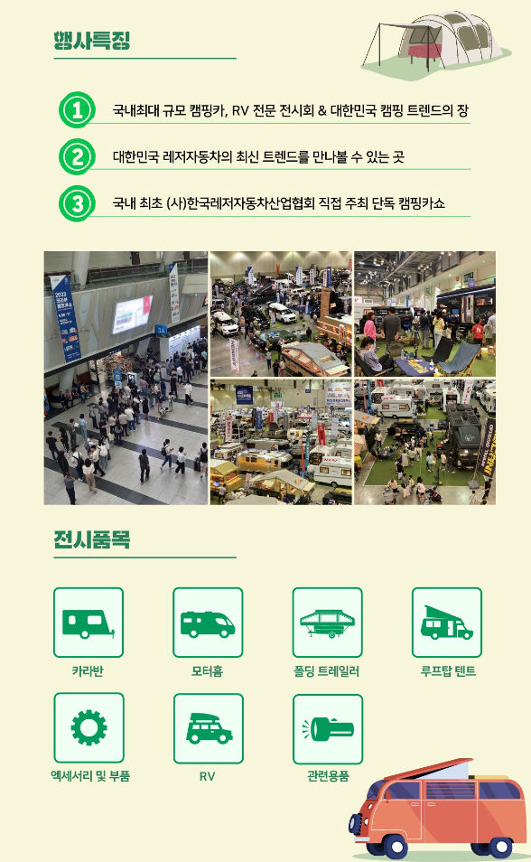 3) 코리아 캠핑카쇼는 국내 캠핑카 및 RV 산업의 최신 기술과 트렌드를 확인할 수 있으며 새로운 모델과 혁신적인 기능을 경험할 수 있는 기회가 있다고 합니다.