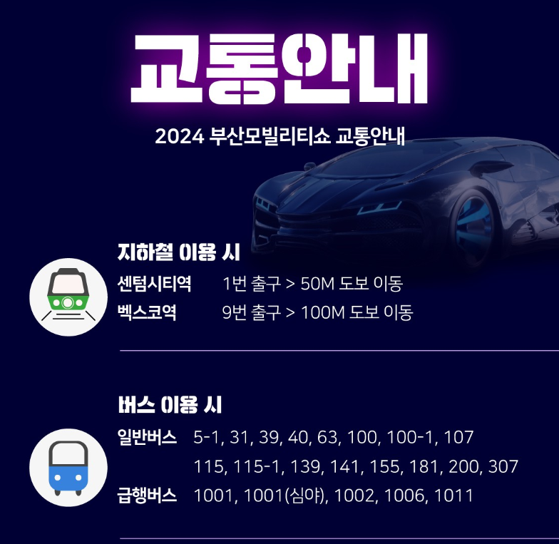 1) 2024 부산모빌리티쇼 교통안내는 다음과 같습니다.