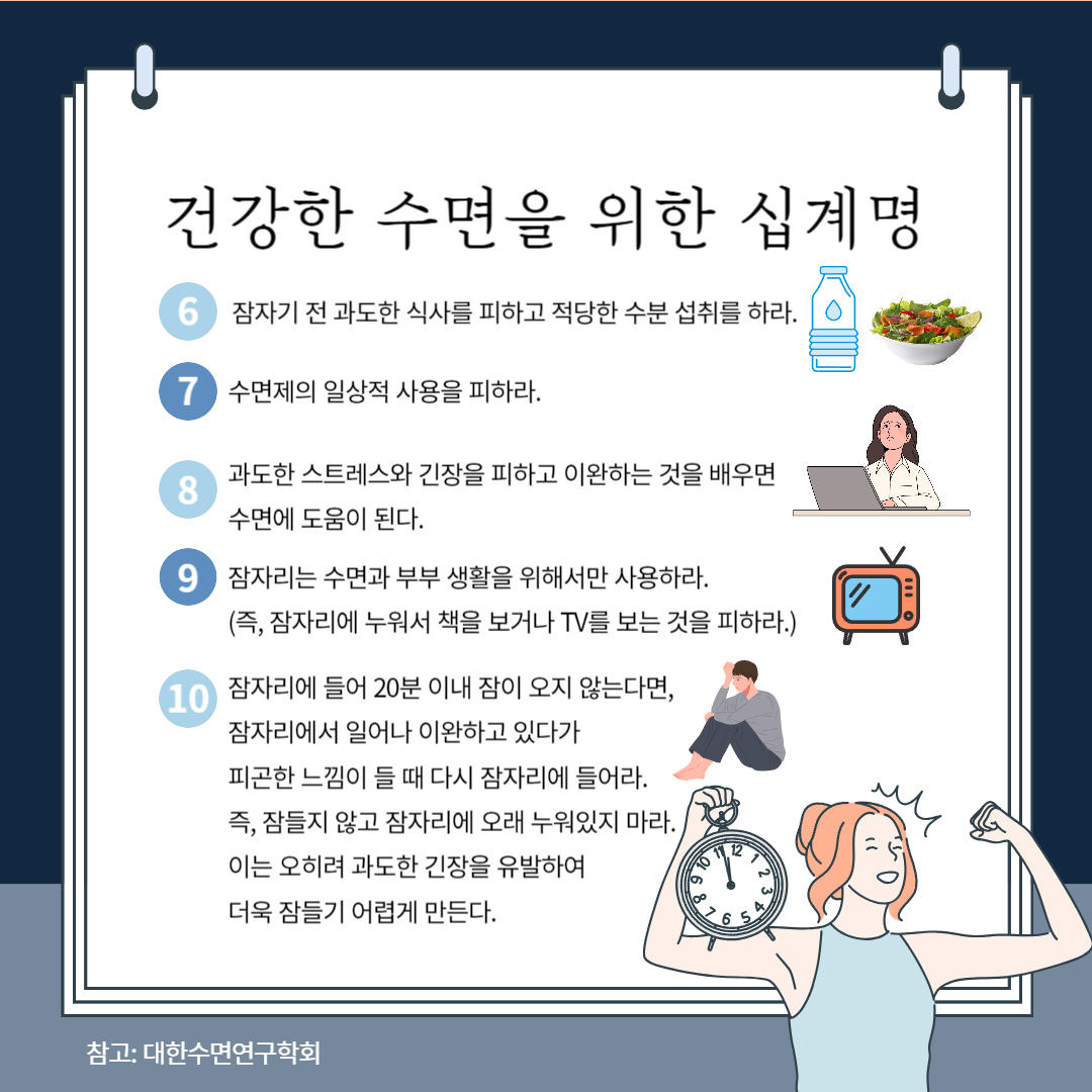 대한수면연구학회에 건강 수면을 위한 10 계명이 있으며 내용은 다음과 같습니다.