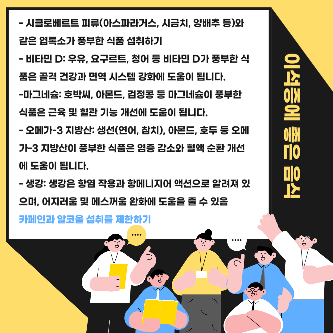 또한 카페인과 알코올 섭취를 제한하거나 피하는 것도 이석증 증상 관리를 위해 권장됩니다.