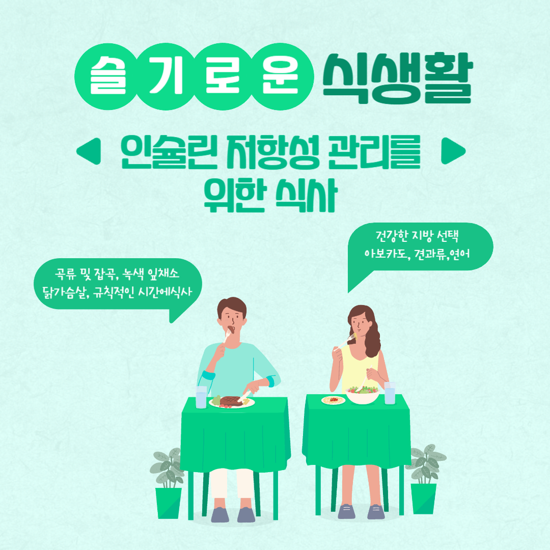 - 스트레스 관리: 스트레스는 인슐린 저항성을 악화시킬 수 있으므로 효과적인 스트레스 관리 방법(운동, 명상, 요가 등)으로 스트레스를 완화시키 주세요