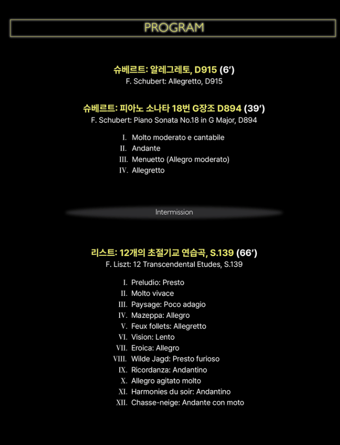장 하오첸 피아노 리사이틀 공연곡은 1부에서는 슈베르트의 '알레그레토 D915'와 '피아노 소나타 G장조 D894'를 연주합니다. 2부에서는 리스트의 '12개의 초절기교 연습곡' 전곡을 연주한다고 합니다.