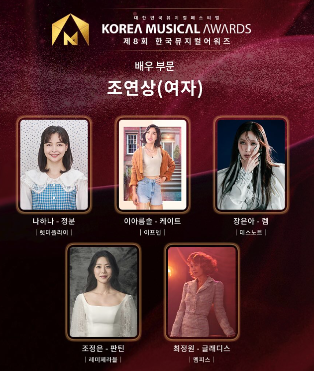 제8회 한국 뮤지컬 어워즈 조연상(여자)에는 나하나(렛미플라이), 이아름솔(이프덴), 장은아(데스노트), 조정은(레미제라블), 최정원(멤피스)이 후보에 이름을 올렸으며, 조연상(남자)에는 김대종(레드북), 김준수(곤투모로우), 김호영(렌트), 서경수(데스노트), 안지환(렛미플라이)이 후보에 올라갔으며 배우 부문 남자 조연상은 렌트의 김호영님 수상하셨습니다.