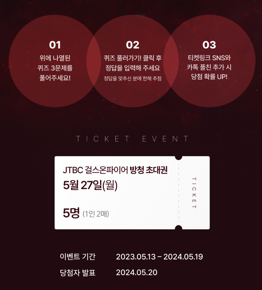 - 이벤트 당첨혜택은 JTBC 걸스 온 파이어 방청 초대권 5명(1인 2매)을 준다고 합니다. (5월 27일 공연)