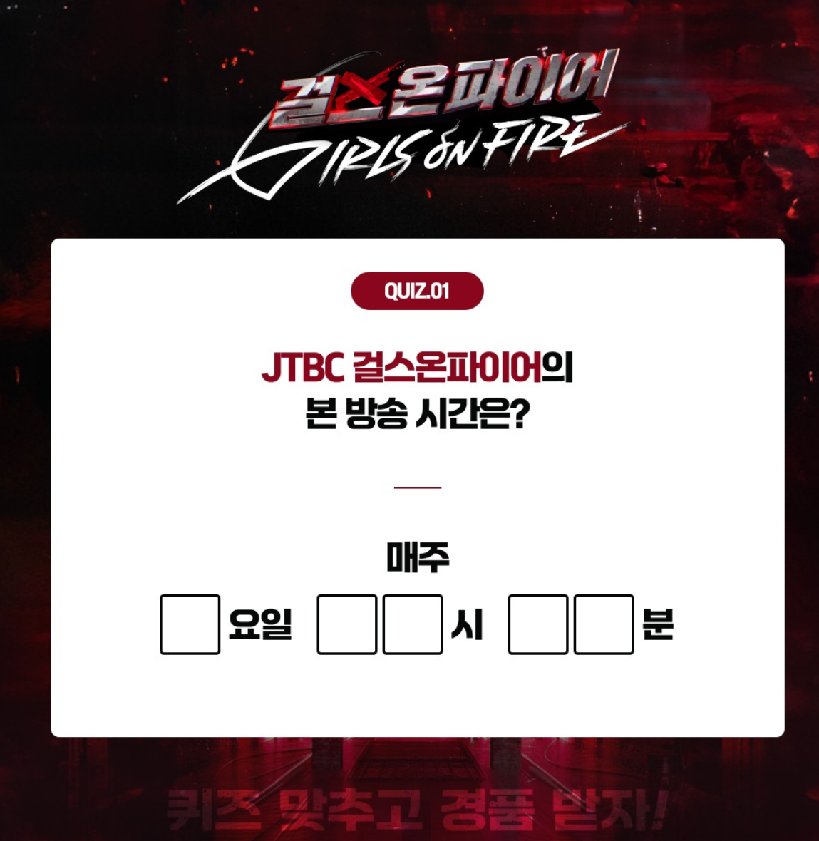매주 화요일 JTBC에 걸스 온 파이어 밤 10시 30분에 방영한다고 합니다.