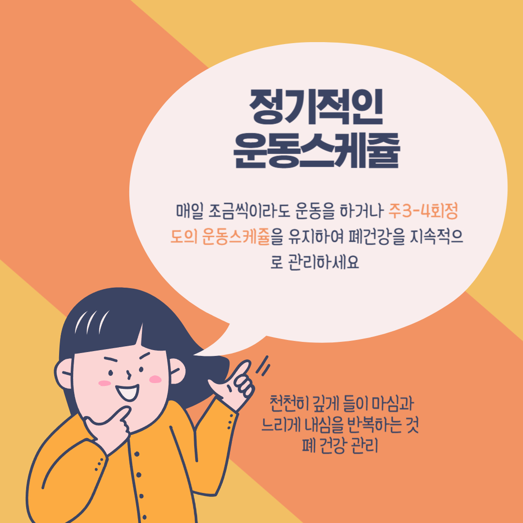 매일 조금씩이라도 운동을 하거나 주 3-4회 정도의 운동 스케줄을 유지하여 폐 건강을 지속적으로 관리하세요.