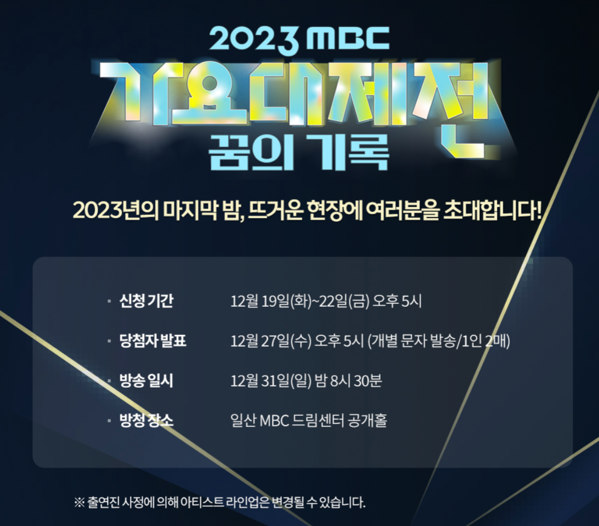 - 2023 MBC 가요대제전 방청 당첨자 발표: 23년 12월 27일 오후 5시(개별문자 발송/1인 2매)