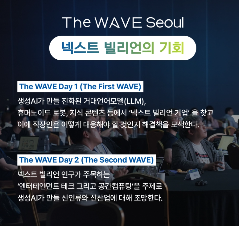 더웨이브 서울 2024는 미래 기술에 관심 있는 모든 사람을 위한 최고의 테크 콘퍼런스로 생성 AI, 엔터테크, 공간 컴퓨팅의 가능성을 탐구한다고 합니다.