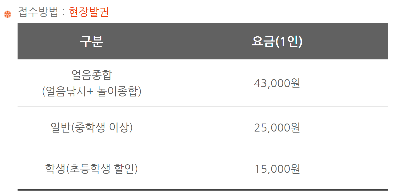 얼음낚시 접수 가격은 다음과 같습니다.