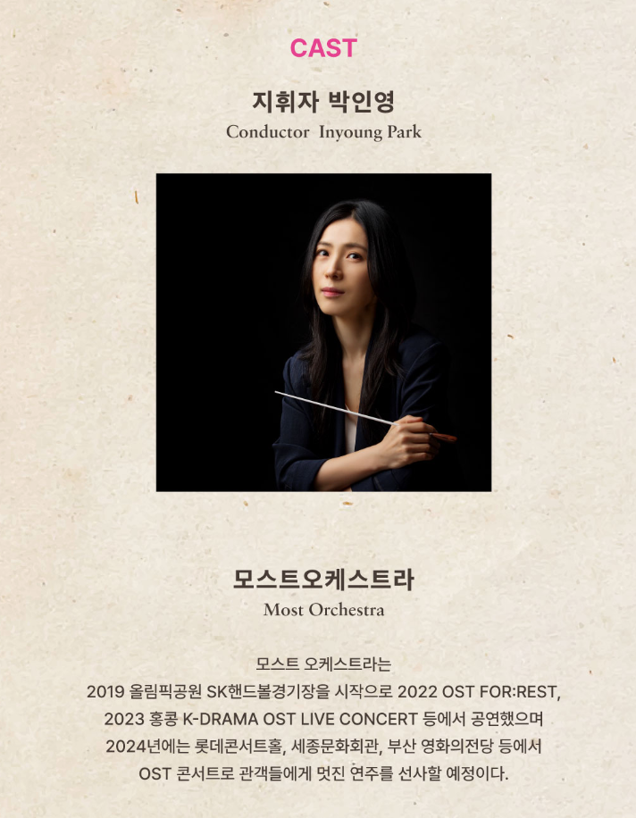 2) 모스트 오케스트라는 2019 올림픽공원 SK핸드볼경기장을 시작으로 2022 OST FOR:REST, 2023 홍콩 K-DRAMA OST LIVE CONCERT 등에서 공연했으며 2024년에는 롯데콘서트홀, 세종문화회관, 부산 영화의 전당 등에서 OST 콘서트로 관객들에게 멋진 연주를 선사할 예정이라고 합니다.