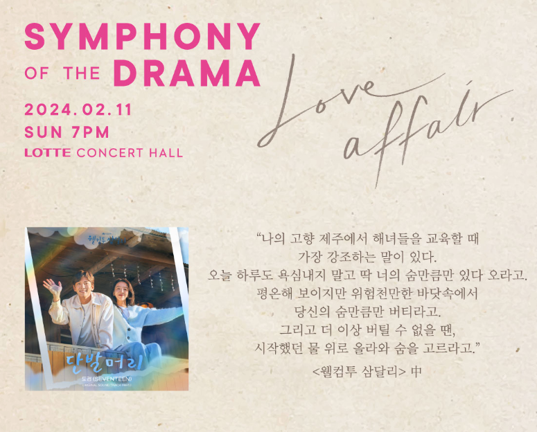 '별에서 온 그대', '그 해 우리는', '킹 더랜드', '웰컴 투 삼달리' 등 그 시절 우리가 가장 사랑했던 드라마 속 음악을 명장면과 함께 오케스트라의 연주로 만나게 될 Symphony Of The DRAMA [Love Affair] 2월 11일 롯데콘서트홀에서 만나보세요.