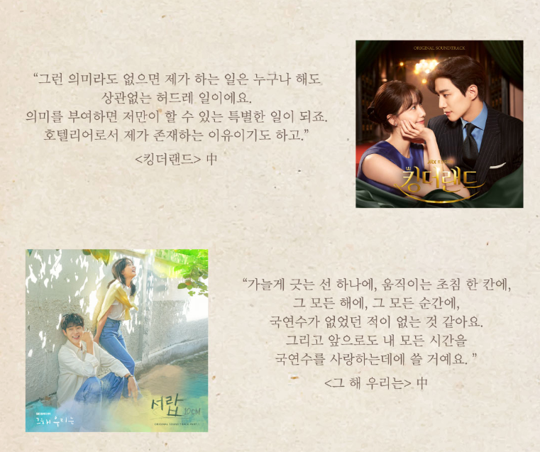 언제나 우리의 삶과 함께하며, 웃음과 감동을 주는 드라마 드라마 속에서 흐르는 음악은 시공간을 초월하고, 인물들이 다른 공간에 있다고 하더라도 두 사람의 감정을 이어주기도 합니다. 눈에 보이지 않는 부분까지 전달하는 또 하나의 대본이죠.